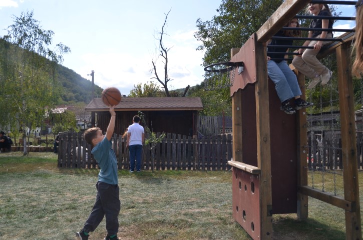 În timp ce părinții stăteau la povești și degustau din bunătățile cumpărate, cei mici alergau prin livadă, se dădeau în leagăne și pe tiroliană, se jucau cu animalele curții și chiar se străduiau să spargă nuci cu o unealtă tradițională.