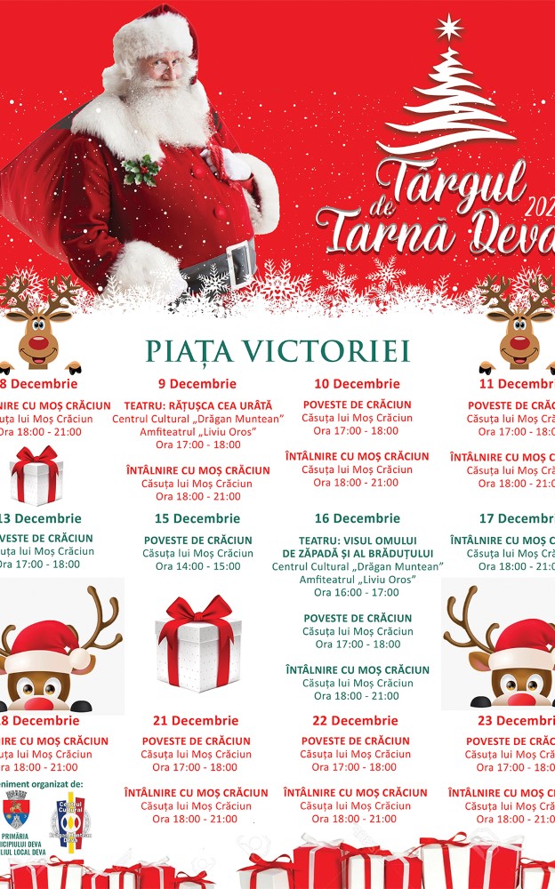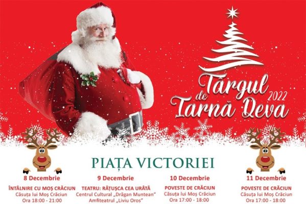 Primăria Municipiului Deva și Centrul Cultural „Drăgan Muntean” invită toți copiii, în perioada 8 decembrie – 23 decembrie 2022, în Piața Victoriei, la ,,Târgul de Iarnă”, unde se vor putea bucura de o mulțime de activități destinate lor.