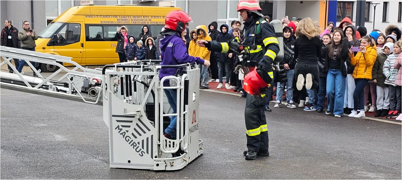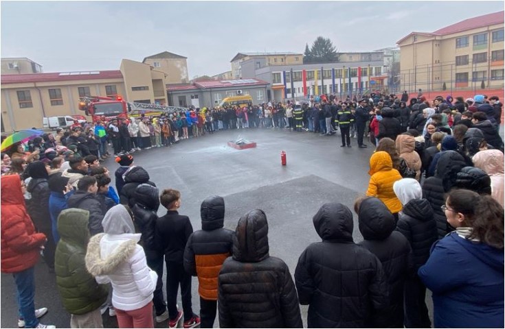 De asemenea, folosirea stingătorului în caz de incendiu a fost o altă temă prezentată participanților la acest exercițiu. Pentru a obține mai multe informații, elevilor li s-au distribuit materiale informative din campaniile naționale „RISC”, „Nu tremur la cutremur” și „FOC” (Flăcările Omoară Copiii).