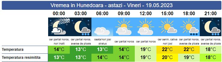 Astăzi avem parte de o atmosferă plăcută, cu înnorări temporare. Spre seară și pe arii restrânse vor mai cădea precipitații. Temperaturile sunt în creștere, iar vântul va sufla slab spre moderat cu intensificări locale. La munte, cerul va fi variabil și cu perioade de ploi însoțite de descărcări electrice. Soarele va apune la ora 20:58. Valorile termice vor urca peste 22 de grade.