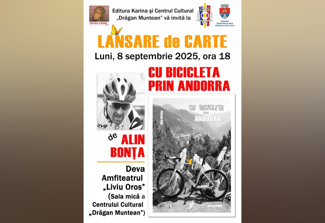Primăria Municipiului Deva și Centrul Cultural „Drăgan Muntean” au plăcerea de a vă invita luni, 8 septembrie 2025, ora 18:00, în Amfiteatrul ,,Liviu Oros” (sala mică a Centrului Cultural „Drăgan Muntean”), la un eveniment literar aparte: lansarea cărții „Cu bicicleta prin Andorra”, semnată de apreciatul autor și aventurier Alin Bonţa.