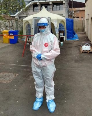Poartă şi ea un costum de protecţie complet, ceea ce nu-i tocmai simplu: “Unii colegi se plâng că transpiră rău în ele, dar mie îmi place căldura. Nu ştiu cum va fi la vară, dar deocamdată e suportabil”, spune profesoara, care îşi continuă şi munca de dascăl: “Lucrez şi de acasă, fac ore online cu copilaşii şi, în timpul liber, vin aici şi îi ajut pe colegi.”