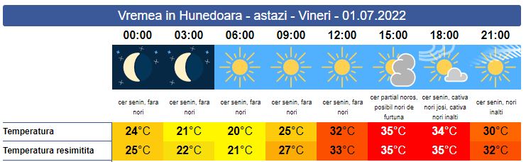 Vineri, discomfort termic accentuat. Soarele va răsări la ora 05:40 și va dogorî până spre după-amiază când, pe alocuri, își vor face apariția norii de ploaie, iar șansele de instabilitate sunt ridicate. Soarele va apune la 21:23. Valorile minime sunt situate în jur de 20 de grade, iar maximele în jur de 35 de grade, la umbră.