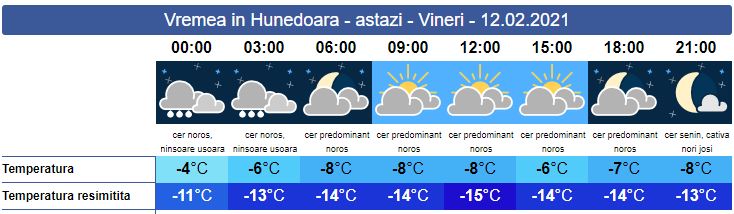 Vineri, zăpadă și temperaturi negative. Soarele răsare la ora 07:34. Un nou val de frig a transformat primăvara timpurie, într-o iarnă capricioasă. În noaptea dintre joi și vineri va ninge pe arii extinse, iar la munte vântul va sufla tare, spulberând zăpada. Temperaturile vor fi foarte reci, iar intensitatea vântului va amplifica senzația de frig. Peste zi, cerul va fi predominant noros. Soarele va apune la ora 17:52. Temperaturile maxime se vor situa în jurul valorii de -4 grade, iar cele minime în jurul valorii de -8 grade, dar le vom resimți mult mai reci.
