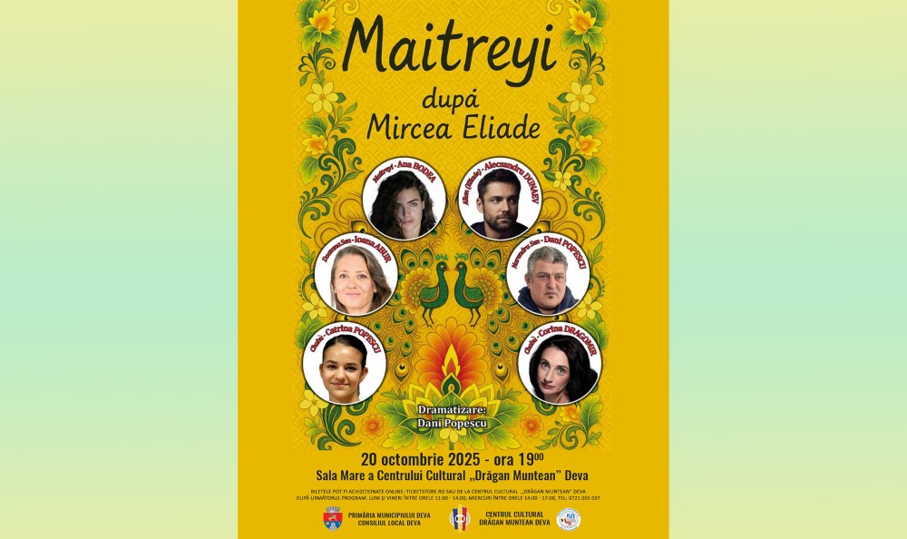 Luni, 20 octombrie 2025, ora 19:00, Centrul Cultural „Drăgan Muntean” Deva găzduiește un eveniment de neratat pentru pasionații de teatru: spectacolul Maitreyi, inspirat din romanul cu același nume semnat de Mircea Eliade.