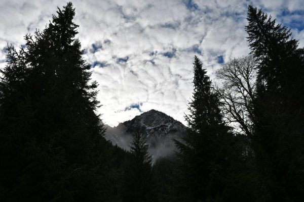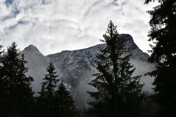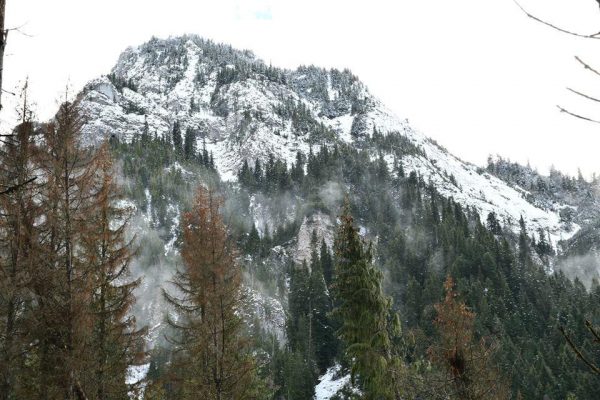 Crestele munților sunt pudrate de neaua proaspăt căzută, iar în zonele joase, toamna încă este prezentă.