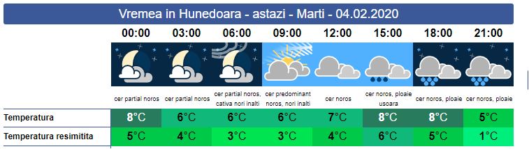 Marți, vremea se menține în general închisă și temperaturile scad ușor. În zona noastră, se vor înregistra precipitații sub formă de ploaie, mai ales în a doua parte a zilei. Temporar vântul va avea unele intensificări. La munte precipitațiile vor fi mixte, iar vântul va spulbera zăpada. Valorile termice vor urca până în jurul temperaturii de de 7-8 grade, iar minimele vor coborî până la +1 grad.