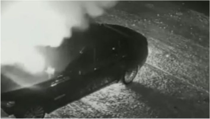 Mașină incendiată, pe o stradă din Orăștie. Camerele de supraveghere au surprins momentul în care a fost provocat incidentul