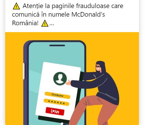 „Tentativă de fraudă prin folosirea imaginii McDonald’s România! Echipa DNSC vă recomandă să fiţi atenţi la campaniile promoţionale false şi să verificaţi întotdeauna că sunteţi pe un canal de comunicare oficial al companiei, înainte de a face click sau a furniza date cu caracter sensibil”, avertizează, marţi, oficialii DNSC.
