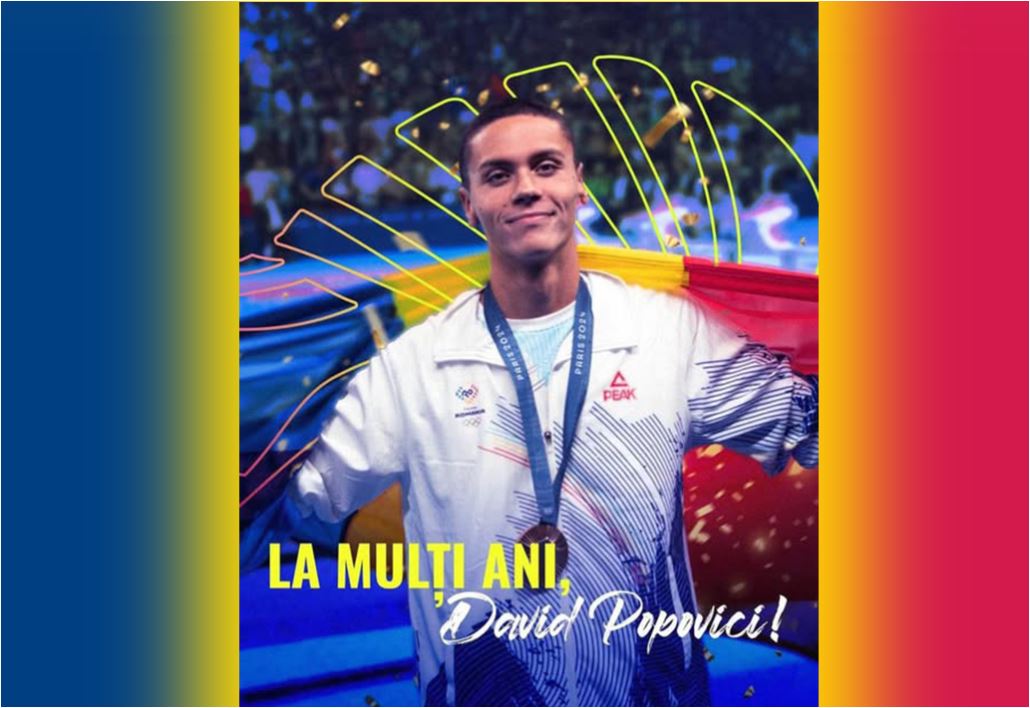 Marele campion la nataţie David Popovici, deţinătorul titlului olimpic la 200 metri liber şi dublu medaliat cu aur la Campionatele Mondiale de la Singapore din acest an, împlineşte, luni, 21 de ani.