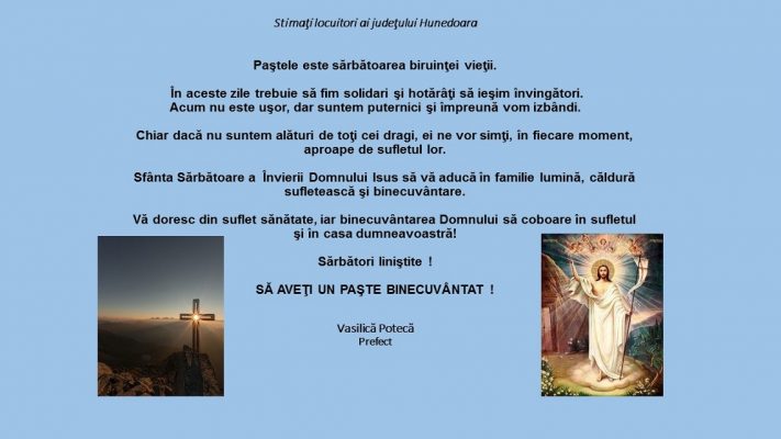 ACTUALITATECOMUNICATE DE PRESĂCOMUNITATE Mesajul prefectului judeţului Hunedoara, adresat hunedorenilor, cu prilejul Sărbătorilor Pascale 18 aprilie 2020 Redacția Replica