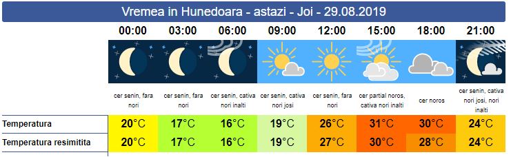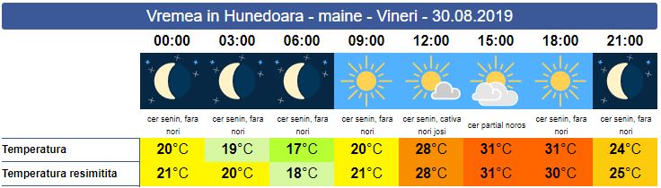 Pentru ziua de mâine, nu vom scăpa de vremea caniculară, indicele ITU va urca până la 80 de unități, temperaturile maxime vor crește până la 31 de grade, iar cele minime se vor situa între 13 și 19 grade, mai ridicate la deal, până 22 de grade. Pe arii restrânse, în special la munte, se pot forma condiții de ploaie însoțite de descărcări electrice.
