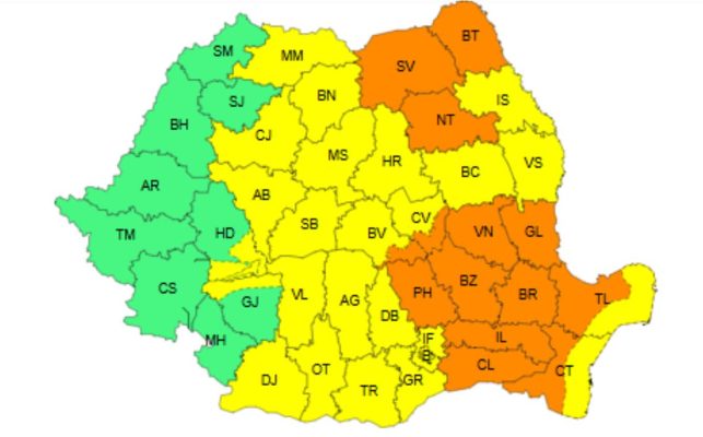 Potrivit sursei citate, va fi cor portocaliu în judeţele Suceava şi Botoşani, unde vor fi averse importante cantitativ şi se vor acumula 30…35 l/mp şi izolat peste 50 l/mp.