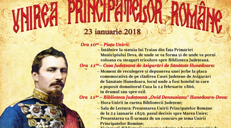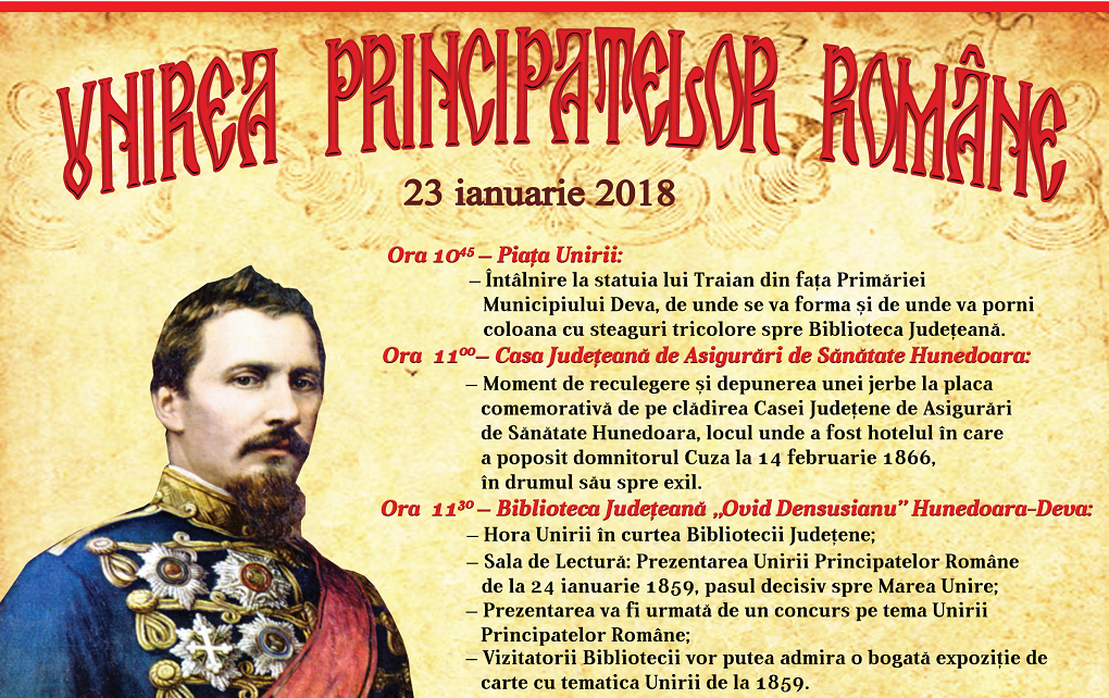 Ziua de 24 ianuarie, ziua Unirii Principatelor Române, va fi marcată și în acest an de către Biblioteca Județeană „Ovid Densusianu” Hunedoara-Deva printr-o activitate specială dedicată acestui eveniment istoric. Anul acesta, evocarea Micii Uniri de la 24 ianuarie 1859 va fi pusă sub semnul centenarului Marii Uniri, eveniment ce focalizează atenția întregii națiuni române.