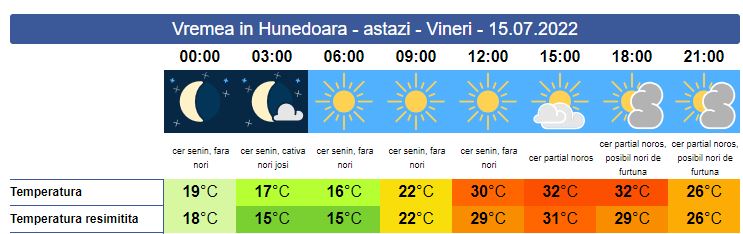 Vineri, cer senin în prima parte a zilei. Soarele răsare la ora 05:51. Începând cu amiaza zilei, temperaturile vor crește semnificativ, iar indicele de temperatură-umezeală (ITU) va atinge și chiar va depăși ușor pragul critic. Spre seară cerul va deveni variabil, iar în zonele înalte posibil să cadă averse însoțit de descărcări electrice. Vântul va sufla slab și moderat. Valorile minime se vor situa între 19 și 17 grade, iar cele maxime vor urca în jurul valorii de 32 de grade.