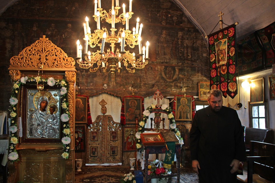 „Când am ajuns eu aici multe din lucrurile de lemn erau învelite în catifea sau acoperite cu tot felul de plasticuri. Nu că oamenilor le-ar fi fost ruşine, dar unii poate că nici nu îşi dau seama cât de frumoase sunt aceste lucruri vechi şi cât de pitorească este pictura pe lemn”, spune preotul. Vocea sa este singura care tulbură liniştea lăcaşului ridicat în secolul 18, în vremuri tulburi. Prin uşa deschisă, lumina puternică de august inundă locul şi scoate din umbre chipurile frumoase ale sfinţilor care te privesc din icoane bătrâne de lemn.