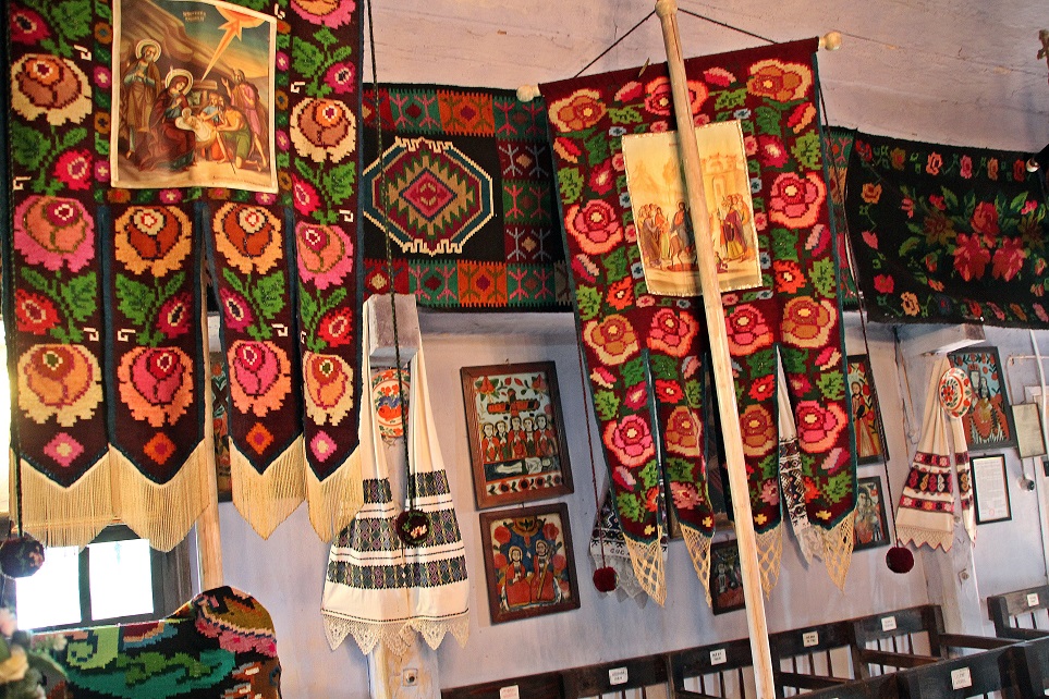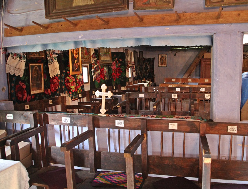 Pe scaunele cuminţi de lemn, se văd scrise numele credincioşilor. Câte vreo pernuţă sau o împletitură de lână e singurul lor confort. Mânerele au lemnul îmblânzit de sutele de ani cât au sprijinit palmele roase de munca grea din satele de munte. Nu are cum să nu te prindă dragul de locul acesta unde lumea vine să se roage şi să se închine nu să zacă cu gândurile nelalocul lor. Peste tot, pereţii sunt acoperiţi de icoane vechi şi covoare ţărăneşti. Lumina zilei intră prin nişte geamuri micuţe în duşuri luminoase îndeajuns de trainice că să desluşească vederii toate minunăţiile, dar şi destul de mici încât să păstreze misterul locului. Aşa sunt bisericile sufletului neamului – lumina vine către suflet de la Cer, prin rugăciune, prin harul şi vorbele preotului, nu prin ferestre şi nicidecum de la reţeaua electrică. Căldura o simţi din ochii blânzi ai chipurilor sfinte. Toate erau pentru suflet, nimic nu strălucea de lux, nici urmă de poleială.
