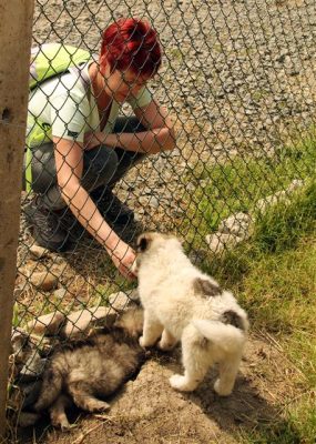 În altă boxă, două pufoşenii dau disperat din codiţe şi se îngresuie să te miroase prin gard, în timp ce sora lor stă ca o broscuţă prăbuşită pe pâmânt.