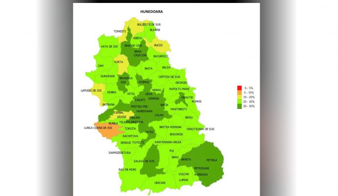 Municipiul Deva este urmat de comuna Peștișu Mic cu 42,64%, comuna Cerbăl cu 39,49%. La nivel județean, municipiul Petroșani se situează pe locul 4, cu un grad de vaccinare de 38,49%.