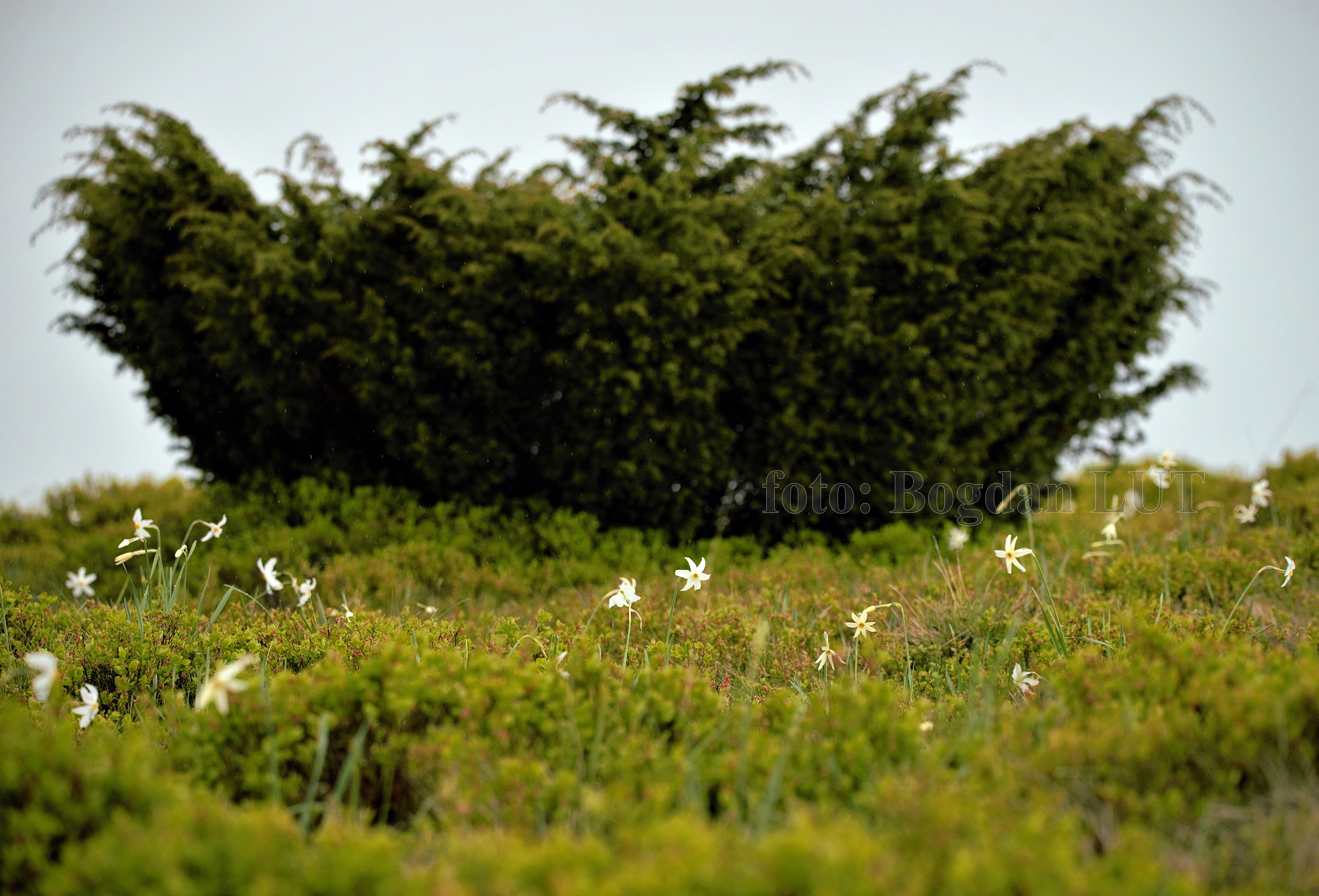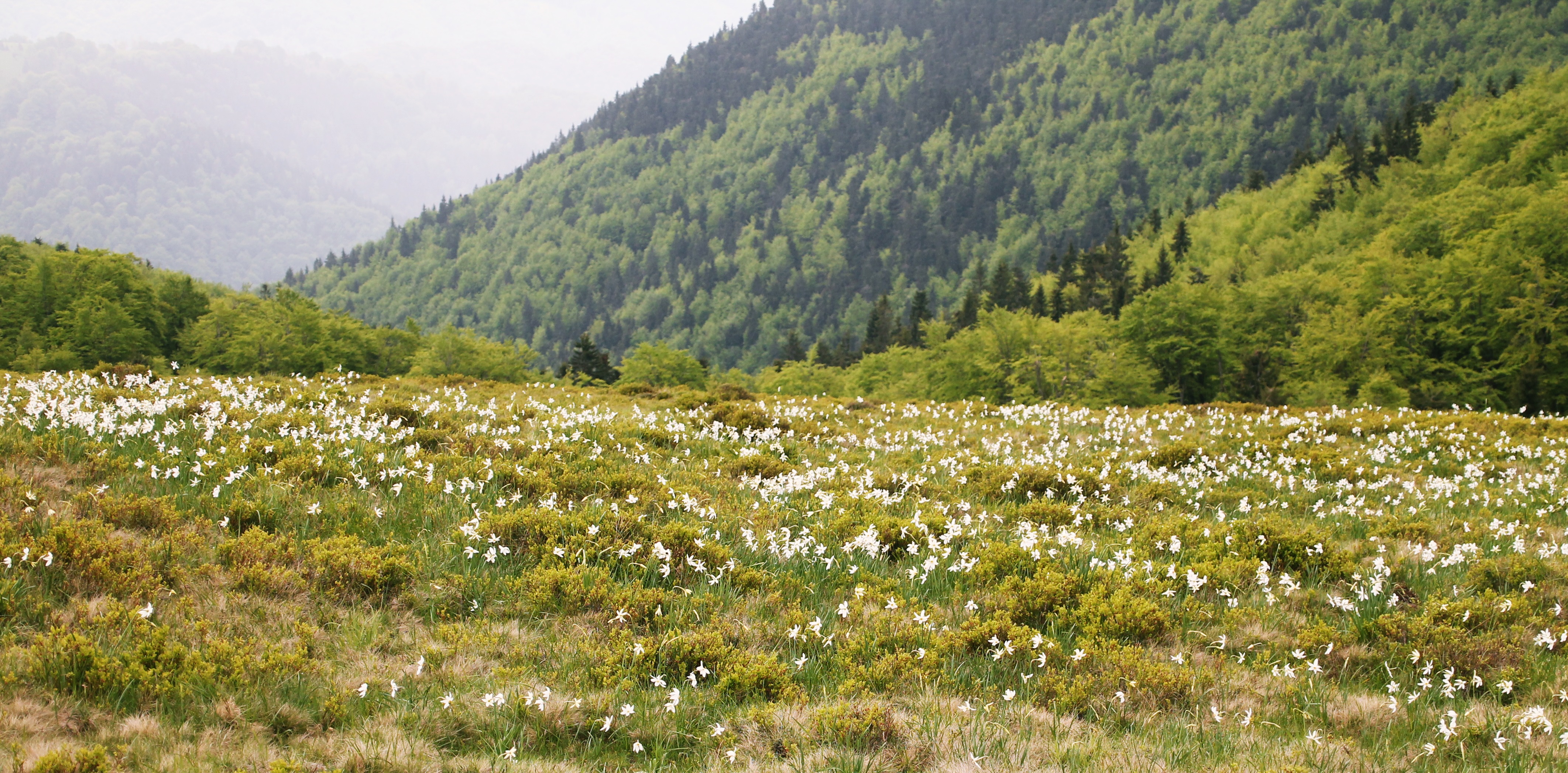 Narcisele se ridică cu miile din iarba aspră a muntelui şi se înalţă elegante din spinările roşiatice ale tufelor de afin. Lujere crude de-abia ţin petalele rânduite precum aripile unor minuscule mori de vânt: albe precum pânzele se strâng roată în mijlocul gălbui ţesut cu fir roşu.