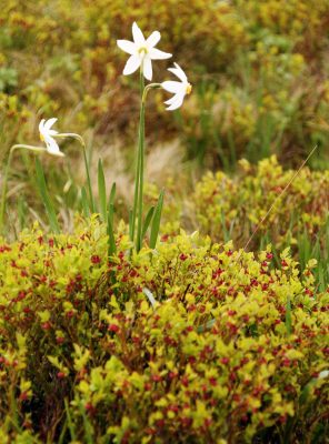 Continuăm drumul pe un plai domol şi cărarea se strecoară asemenea unui şarpe prin pajişte. De-a stânga şi de-a dreapta, ne străjuiesc tufe roşiatice decorate bogat cu florile de afin ca nişte clopoţei minusculi. Şi, deodată, le vezi: narcisele sunt pete albe, răzleţe în nebunia de culori din aşternutul muntelui.