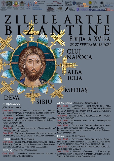 Muzeul Civilizaţiei Dacice şi Romane Deva, cu sprijinul Consiliului Județean Hunedoara, în colaborare cu Facultatea de Teologie Ortodoxă din Alba-Iulia, Universitatea de Artă și Design din Cluj-Napoca, Grupul „Sfântul Ioan Damaschin” din Cluj-Napoca, Episcopia Devei și Hunedoarei și Liceul de Arte „Sigismund Toduță”, vă invită să participați luni, 27 septembrie 2021, ora 17.00, la manifestarea intitulată „Zilele Artei Bizantine”.