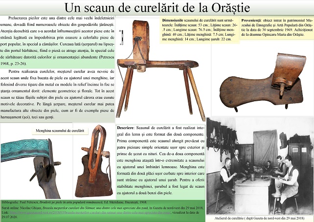 Astăzi vă prezentăm o piesă deosebită din cadrul colecției Muzeului din Orăștie ce amintește de meșteșugul curelăritului, în prezent tot mai rar întâlnit. Este vorba despre un scaun pentru curelărit, instrument la care, cu ajutorul unor mâini dibace se puteau realiza șerparele bogat decorate, cât și alte piese deosebite din piele. Scaunul are o stare foarte bună de conservare, fiind achiziționat de muzeul orăștian în 1969>>, relatează specialiștii muzeului din Orăștie: muzeograf, Daniela Șendroiu, arheolog, Adrian Cătălin Căsălean.