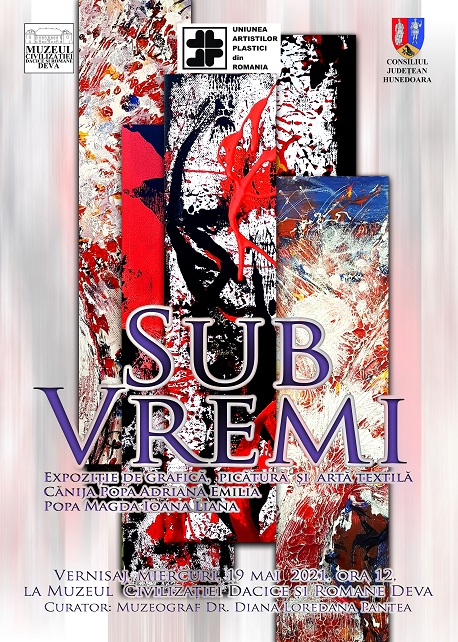 Muzeul Civilizației Dacice și Romane din Deva cu sprijinul Consiliului Județean Hunedoara vă invită miercuri, 19 Mai 2021, ora 12:00, să participați la vernisajul expoziţiei de grafică, pictură şi artă textilă: „Sub vremi” semnată Dr. Adriana Emilia Cănija Popa. Vernisajul expoziției se va desfășura în curtea Palatului Magna Curia.