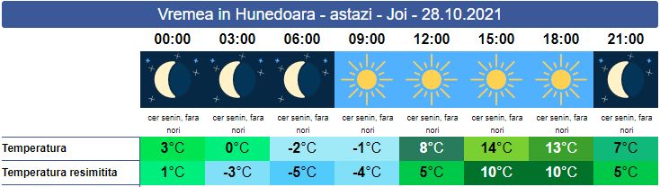 Joi, o altă zi însorită. Soarele răsare la ora o8:00. Temperaturile pe timpul nopții și în prima parte a dimineții se mențin negative, sub media normală a acestei perioade. Spre amiază atmosfera se va încălzi treptat și va deveni plăcută. La munte vântul va sufla cu unele intensificări. Soarele va apune la ora 18:23. Maxima zilei va urca în jurul valorii de 15 grade.