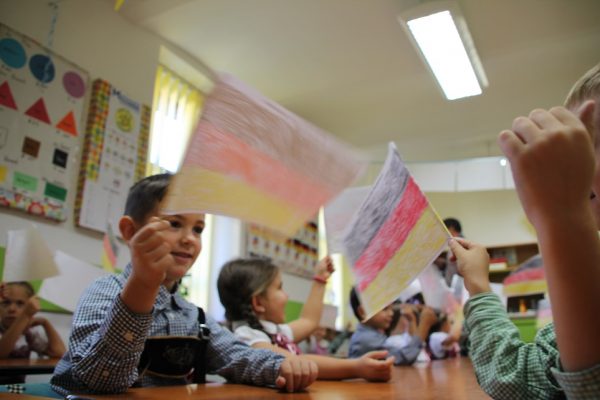 Fiecare copil şi-a pregătit şi colorat un steag al Germaniei. Răspund imediat la întrebările educatoarei: „Astăzi e ziua în care Germaniile s-au unit şi au devenit una mare! Capitala e la Berlin!”