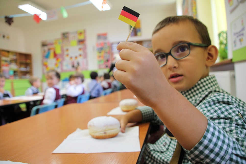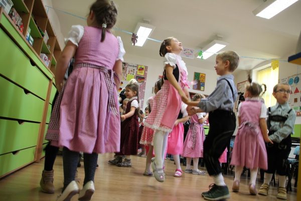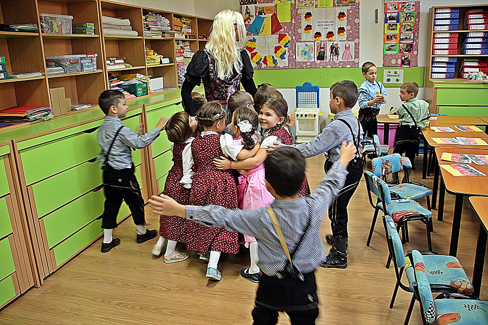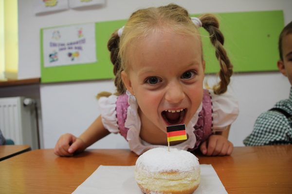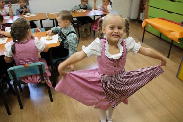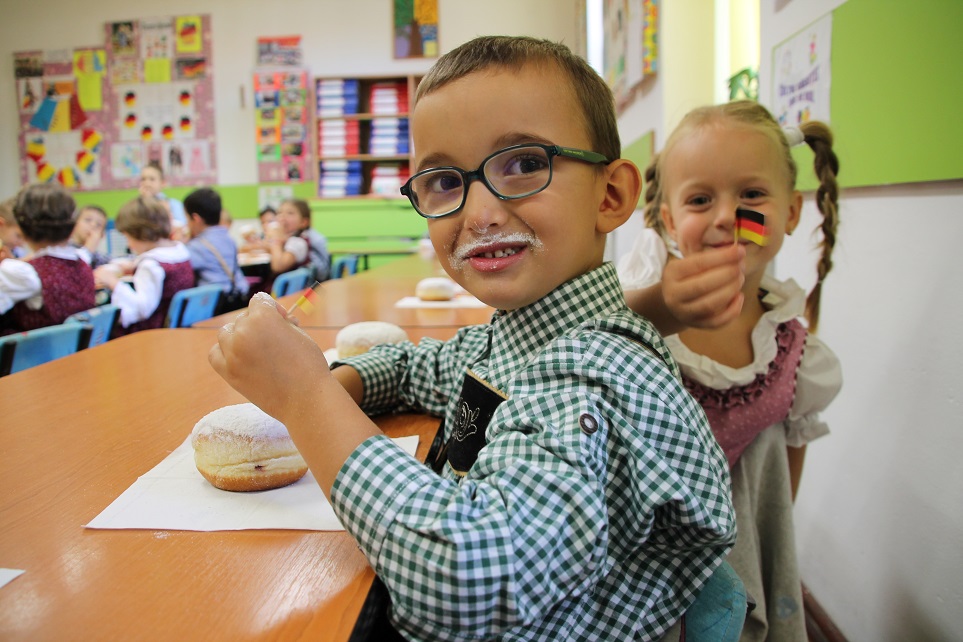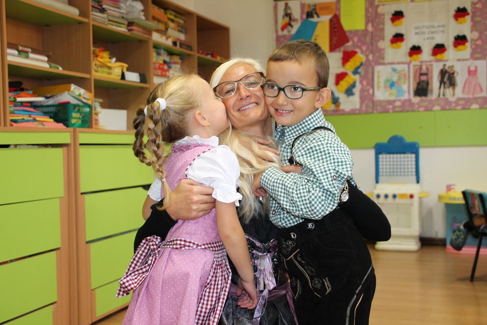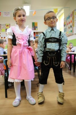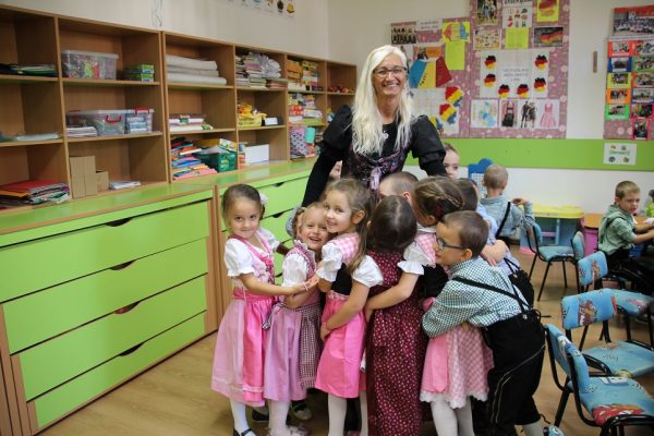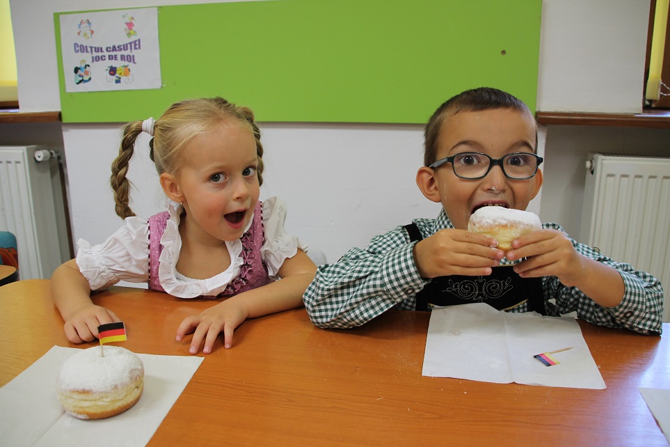 „De ziua Germaniei, am pregătit un program artistic, dans, cântece şi voie bună, berline şi sucul tradiţional de mere care se bea în această zi. Aşa se sărbătoreşte şi în Germania, în costume tradiţionale pe care oamenii le poartă şi la birou. E voie bună peste tot”, spune Mirela Blaj, educatoarea care iniţiază micuţii în tainele limbii lui Goethe.