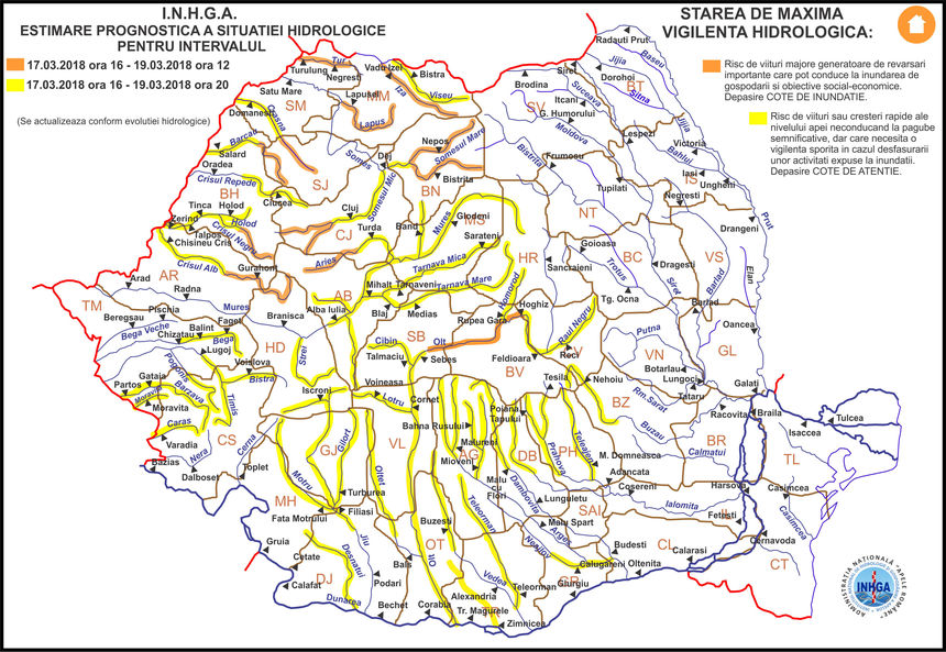 Hidrologii au emis, sâmbătă, noi avertizări cod galben de inundaţii pe râuri din 29 de judeţe şi cod portocaliu de inundaţii pe râurile din 11 judeţe, începând de sâmbătă până luni, interval în care, din cauza ploilor şi topirii zăpezii existente încă, vor fi scurgeri pe versanţi, torenţi, pâraie, viituri pe râurile mici cu posibile inundaţii locale şi creşteri de debite şi niveluri pe unele râuri şi cu posibile depăşiri ale cotelor de apărare. De asemenea, sâmbătă a intrat în vigoare o atenţionare cod galben de ploi în zona de vest a ţării, iar începând de la ora 18.00 va fi în vigoare o avertizare cod galben de lapoviţă şi ninsoare, cu intensificări ale vântului, în jumătatea de nord a Moldovei şi în zona Carpaţilor Orientali.
