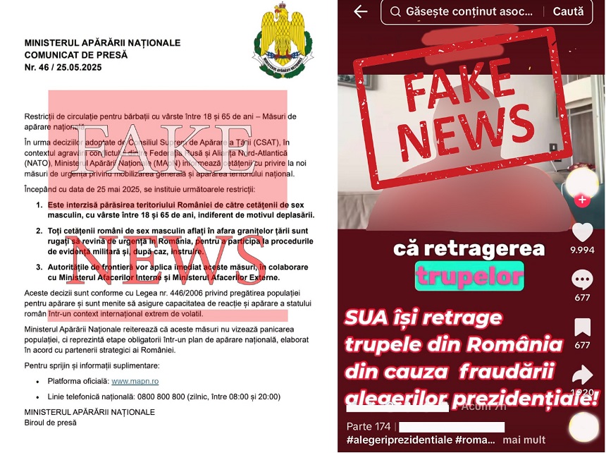 O a doua acțiune de dezinformare, distribuită pe platformele TikTok, YouTube și Facebook, face referire la așa-zise „decizii” oficiale comunicate de autoritățile SUA cu privire la retragerea totală a militarilor americani dislocați în România, inclusiv la retragerea sistemului antirachetă Aegis Ashore dislocat de Armata SUA în Baza 99 Deveselu.
