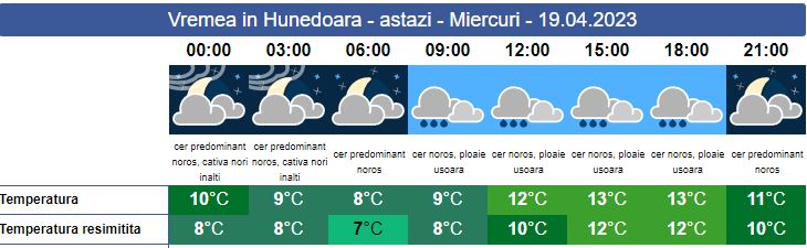 Miercuri vremea va fi închisă. Soarele răsare la ora 06:36. Norii vor se vor aduna încă din timpul nopții, iar peste zi vor acoperii cerul. Se vor semnala ploi ușoare pe arii extinse. În zonele montane se cor înregistra lapoviță și ninsori. Vântul va sufla cu unele intensificări în zona montana. Soarele va apune la ora 20:20. Maxima zilei va urca spre 13 grade.