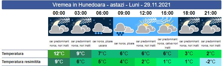Luni, față de ziua precedentă vremea se va răci. Soarele va răsări la ora 07:44. Peste noapte și în prima parte a zilei se vor înregistra ploi, apoi cerul va deveni variabil spre noros. La munte vor predomina ninsorile, slabe cantitativ. Vântul va sufla slab spre moderat cu intensificări la munte. Soarele va apune la ora 16:48. Valorile termice maxime se vor situa în jurul valorii de 6 grade.