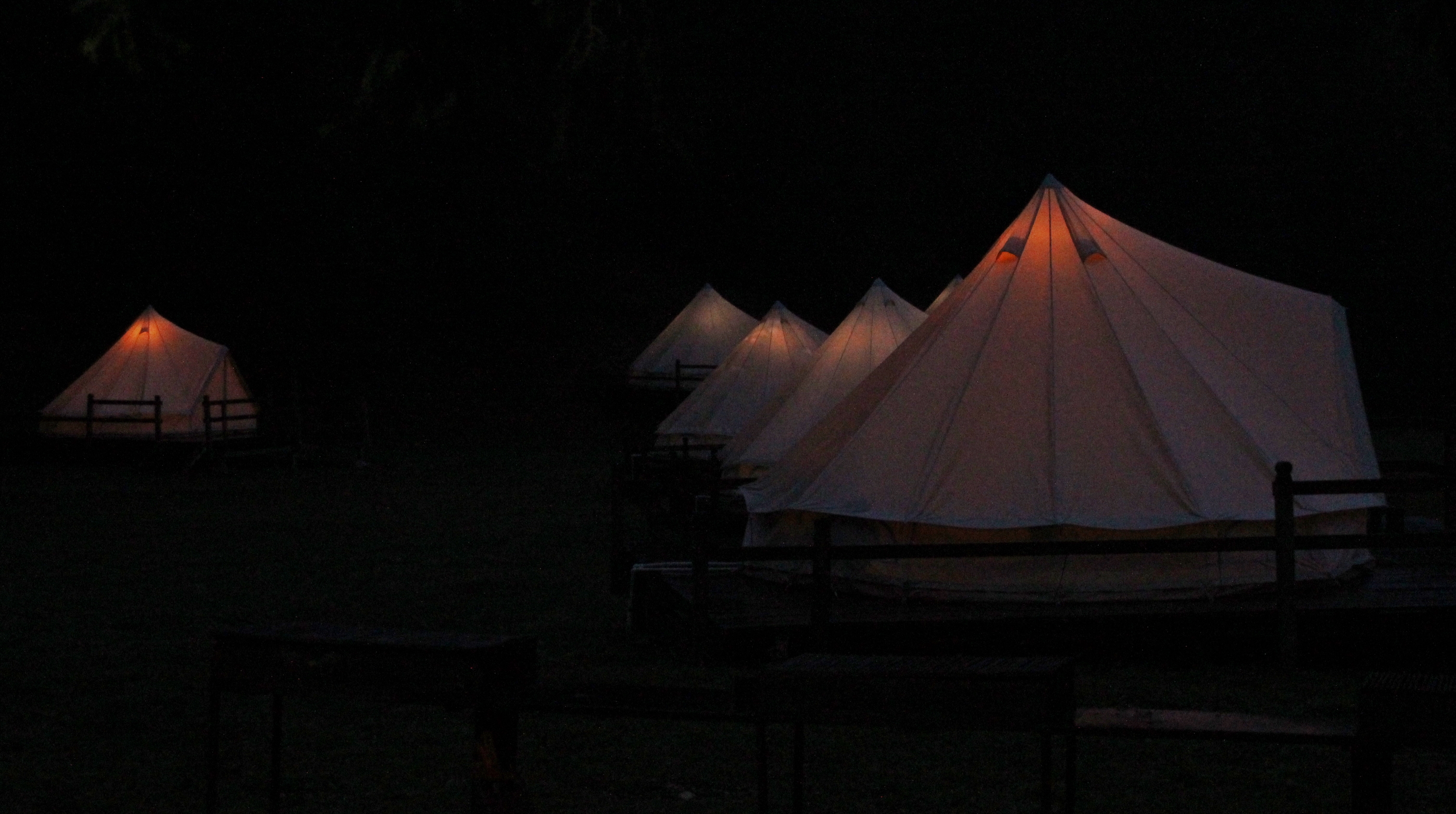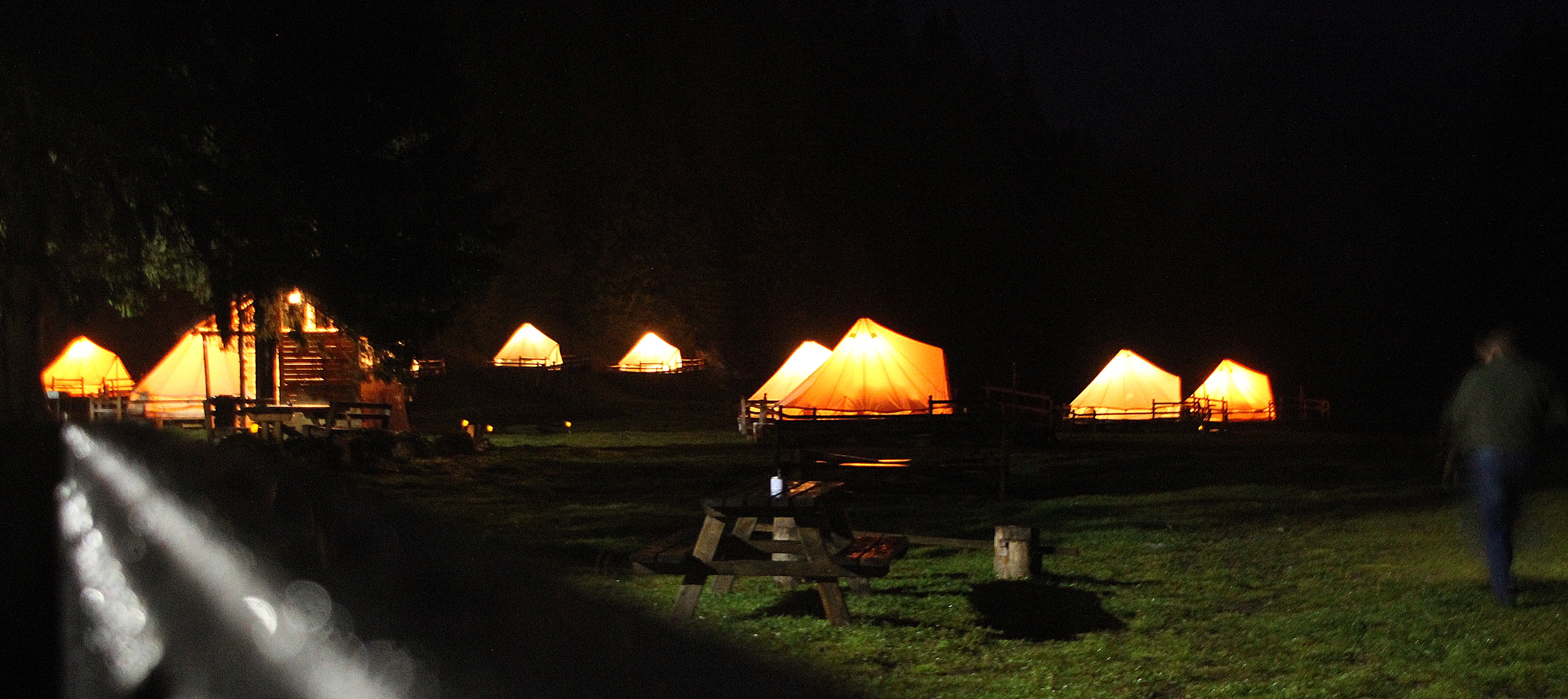 Dar, oricât ar fi de frumos locul în timpul zilei, imaginea corturilor luminate în noapte, îţi taie răsuflarea: licurici uriaşi par să se odihnească pe iarba poienii şi creează o adevărată feerie caldă în întunericul nopţii.