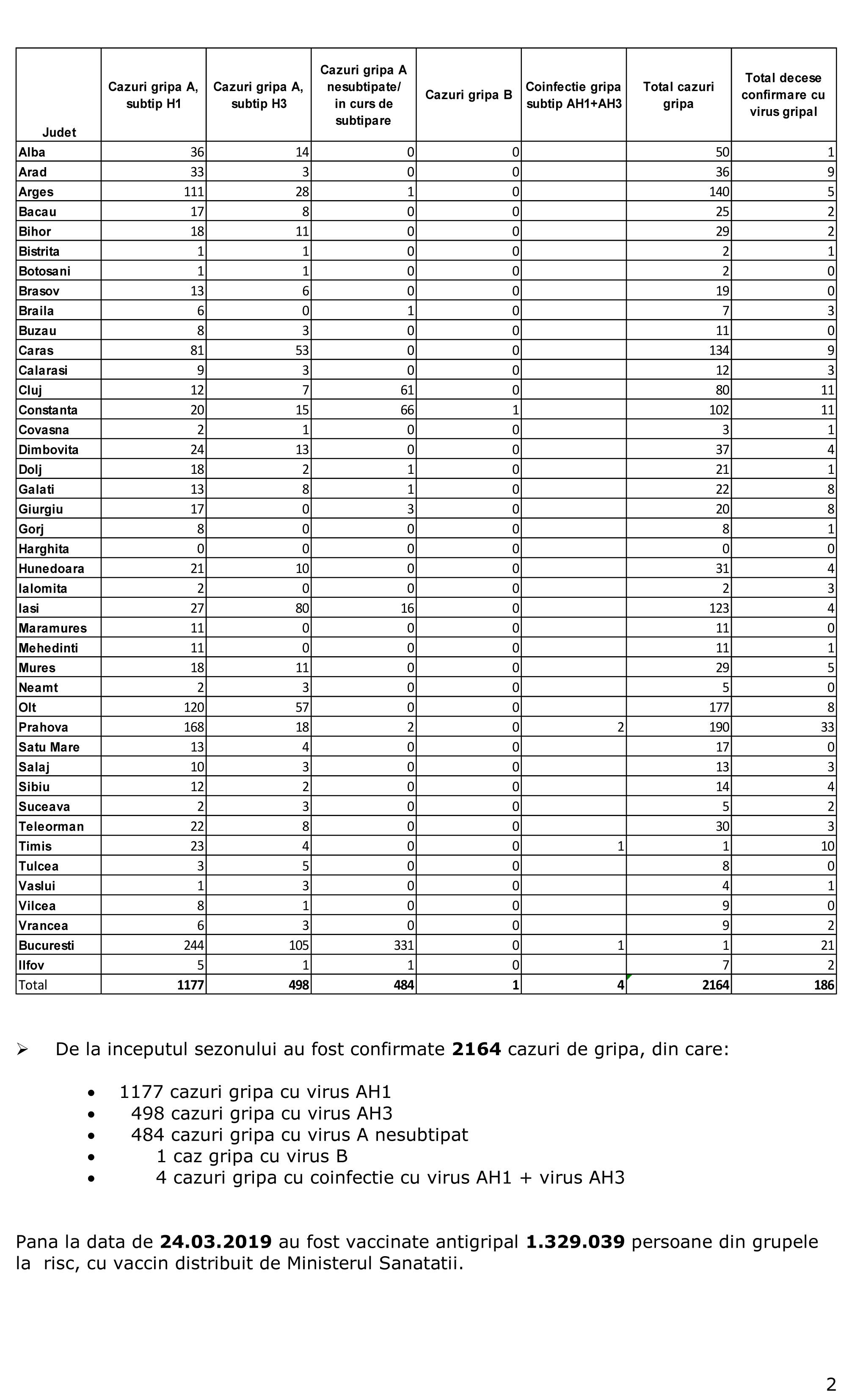 Este vorba despre un bărbat de 84 de ani din judeţul Cluj, confirmat cu virus gripal tip A, având condiţii medicale pre-existente. Decesul acestuia a survenit în cursul zilei de duminică.
