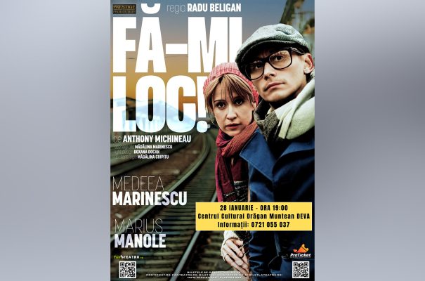 Centrul Cultural „Drăgan Muntean” din Deva găzduiește miercuri, 28 ianuarie 2026, de la ora 19:00, spectacolul de teatru „Fă-mi loc!”, o comedie romantică sensibilă, organizată de Prestige Production și regizată de Radu Beligan. Pe scenă vor putea fi admirați doi dintre cei mai îndrăgiți actori ai teatrului românesc: Medeea Marinescu și Marius Manole.