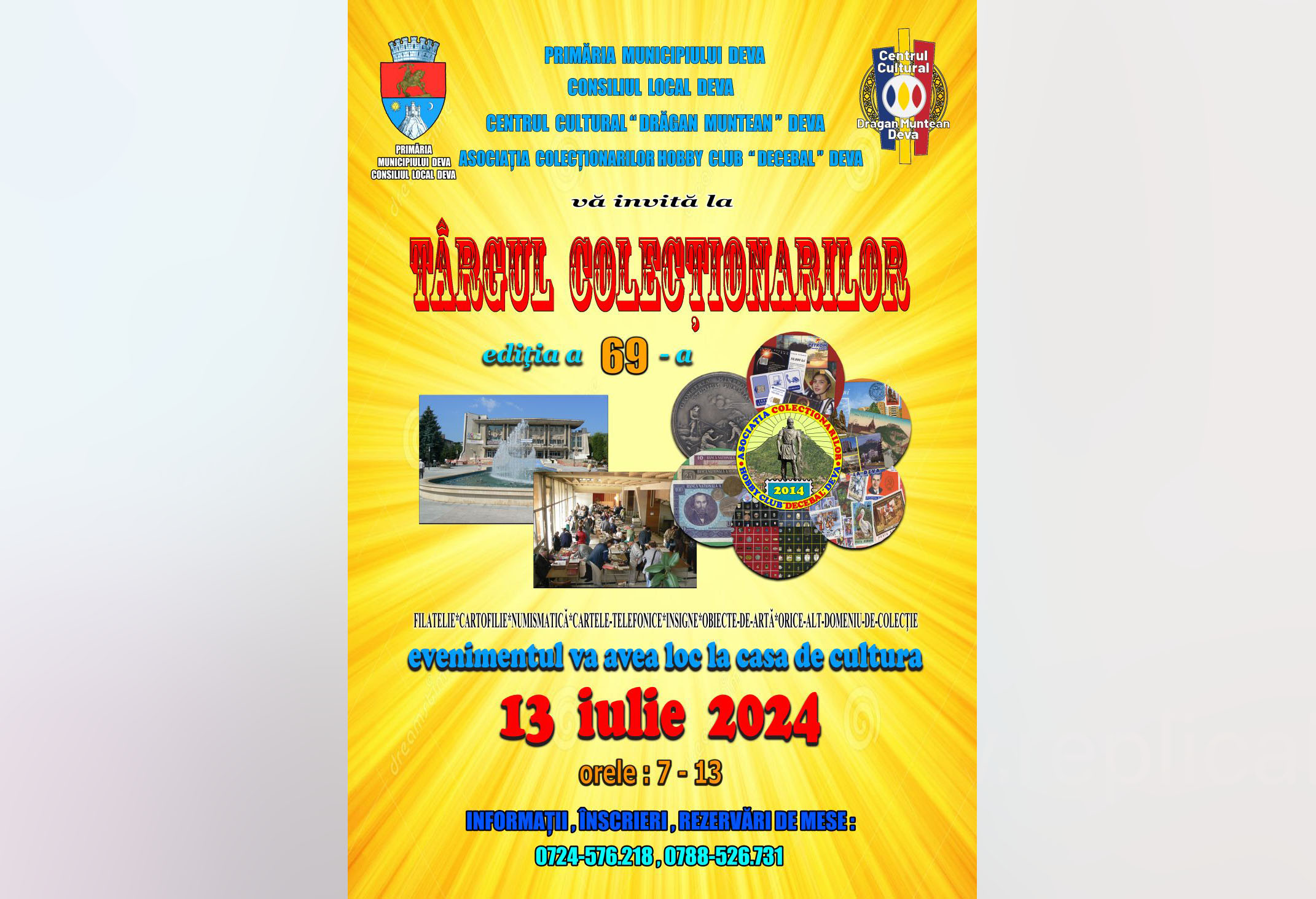 Primăria Municipiului Deva și Centrul Cultural „Drăgan Muntean” vă invită în data de 13 iulie 2024, între orele 07:00 -13:00, în Holul Mare al Centrului Cultural ,,Drăgan Muntean” Deva, la Târgul Colecționarilor, eveniment ajuns la ediția cu numărul 69.