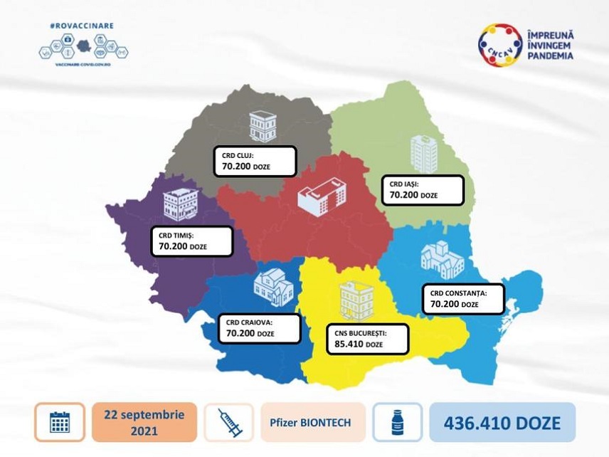 Astfel, procesul de vaccinare continuă atât în centrele din Bucureşti, cât şi din ţară, dozele fiind distribuite la Centrul Naţional de Stocare Bucureşti – 85.410 doze; Centrul Regional de Depozitare Cluj – 70.200 doze; Centrul Regional de Depozitare Craiova – 70.200 doze; Centrul Regional de Depozitare Constanţa – 70.200 doze; Centrul Regional de Depozitare Iaşi – 70.200 doze; Centrul Regional de Depozitare Timiş – 70.200 doze.