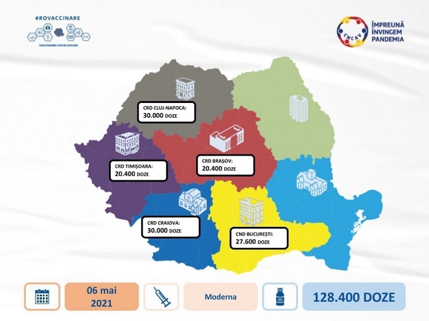 Ulterior, dozele de vaccin vor fi distribuite, după cum urmează: Centrul Naţional de Stocare Bucureşti: 27.600 doze; Centrul Regional de Depozitare Braşov: 20.400 doze; Centrul Regional de Depozitare Cluj: 30.000 doze; Centrul Regional de Depozitare Craiova: 30.000 doze; Centrul Regional de Depozitare Timişoara: 20.400 doze.