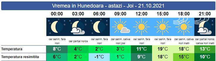 Joi, zi cu valori între iarnă și vară. Soarele răsare la ora 07:51. Din a doua parte a nopții, temperaturile vor fi foarte scăzute, inclusiv dimineața când ceața va acoperi cerul. În zonele de deal temperaturile vor coborî sub limita înghețului și se va produce bruma. În timpul zilei, valorile vor crește treptat ajungând la cele specifice de vară. Soarele va apune la ora 19:06. Maxima zilei se va actualiza la peste 20 de grade.