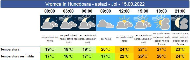 Joi, cerul va fi parțial noros. Soarele răsare la ora 07:04. Peste noapte și dimineață atmosfera este plăcută, temperaturile vor fi mai ridicate și cu aproape 10 grade peste cele înregistrate în același interval, din ziua precedentă. În prima parte a zilei cerul va fi mai mult noros, apoi vor fi și perioade însorite. În zona noastră șansele de ploaie sunt reduse, dar spre seară se va înnora accentuat. Soarele va apune la ora 19:42. Minimele se vor înregistra între 16 și 18 grade, iar maxima zilei va urca în jur de 26 de grade.