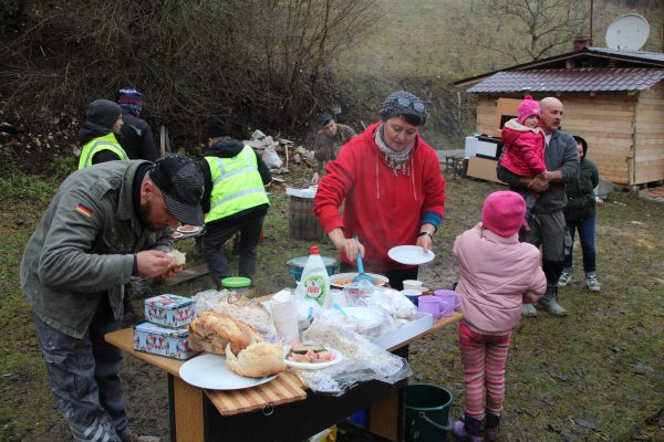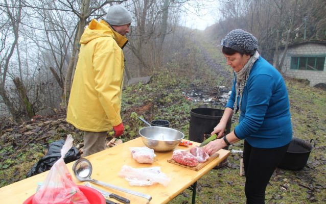 În spatele casei, Silvia Olari şi Daniel Ianoş se ocupă de bucătăria „Ajută satul”: unul grijeşte de foc şi ceaun, ea face gulaşul şi o tocăniţa de cartofi de post. Când e gata masa, aromele umplu locul şi oamenii se strâng roată în jurul ceaunului. Nimeni nu mănâncă până când, la îndemnul/poruncă al bucătăresei, nu se spun rugăciunile de mulţumire.