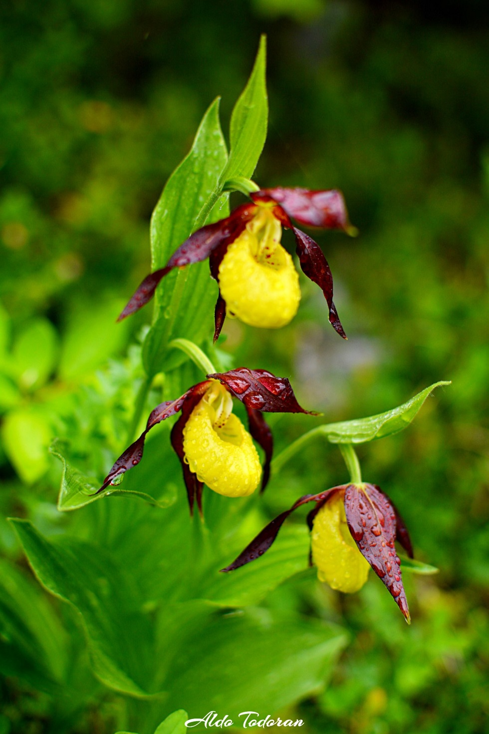 Papucul doamnei este o specie de orhidee aparținând genului Cypripedium. Aldo Todoran a surprins firavele flori pe crestele Carpaților. Papucul doamnei, apare în pădurile umbroase de foioase și mixte (rareori în plină lumină solară la altitudini mai mari) sau mai rar, pe versanții împrăștiați cu pietre, predominant pe soluri calcaroase.