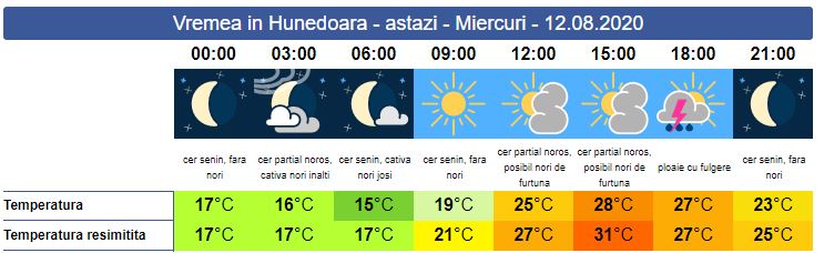 Miercuri, vremea va fi în continuare călduroasă cu cer variabil. Soarele răsare la ora 06:23. Cu cer senin ne vom întâlni în prima parte a zilei, iar apoi spre amiază se vor aduna norii. Probabilitatea de ploaie se anunță pe arii restrânse, în special în zonele de deal și munte. Soarele apune la ora 20:42. Temperatura maximă resimțită se va situa în jurul valorii de 31 de grade.