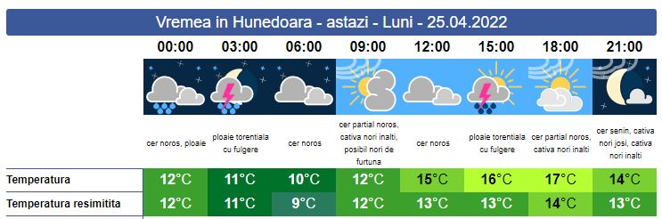 Pe timpul zilei cerul va fi variabil cu perioade de înnorări, ploi, dar și cu ceva soare care va apune la ora 20:28. Valorile termice se vor situa între 10 și 17 grade.
