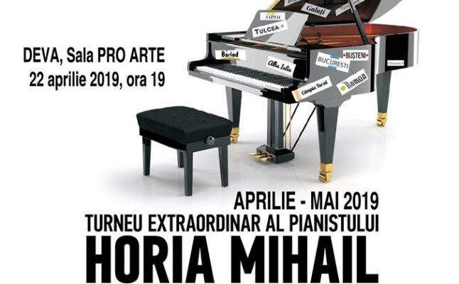 Primăria Municipiului Deva și Centrul Cultural „Drăgan Muntean” vă invită, luni, 22 aprilie 2019, la ora 19:00, în Sala „Pro Arte” a Colegiului Național „Decebal”, la un recital „Pianul călător”, susținut în cadrul turneului extraordinar al pianistului Horia Mihail.