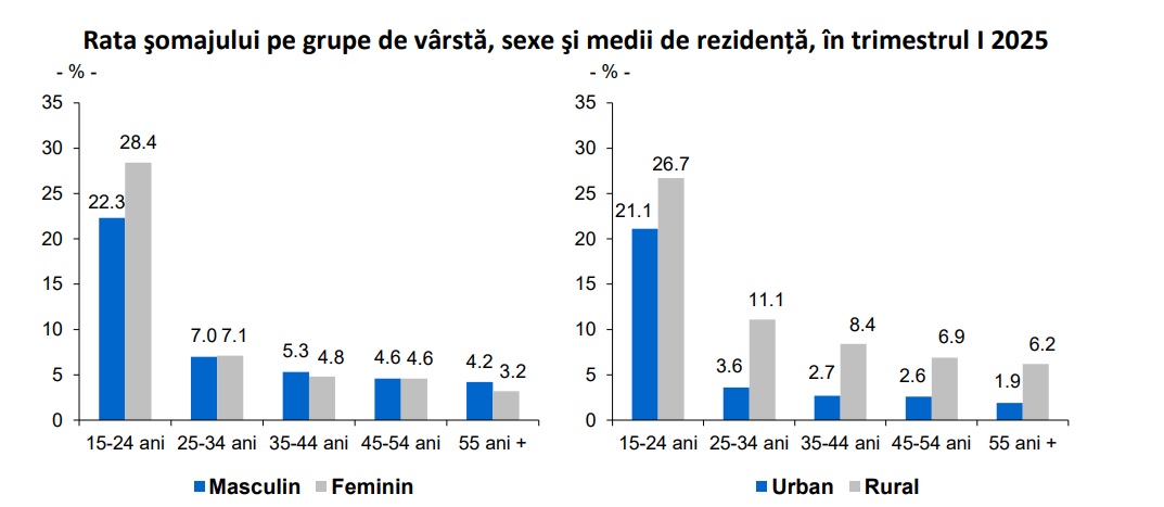 Pe grupe de vârstǎ, rata şomajului a atins nivelul cel mai ridicat (24,6%) în rândul tinerilor (15-24 ani).