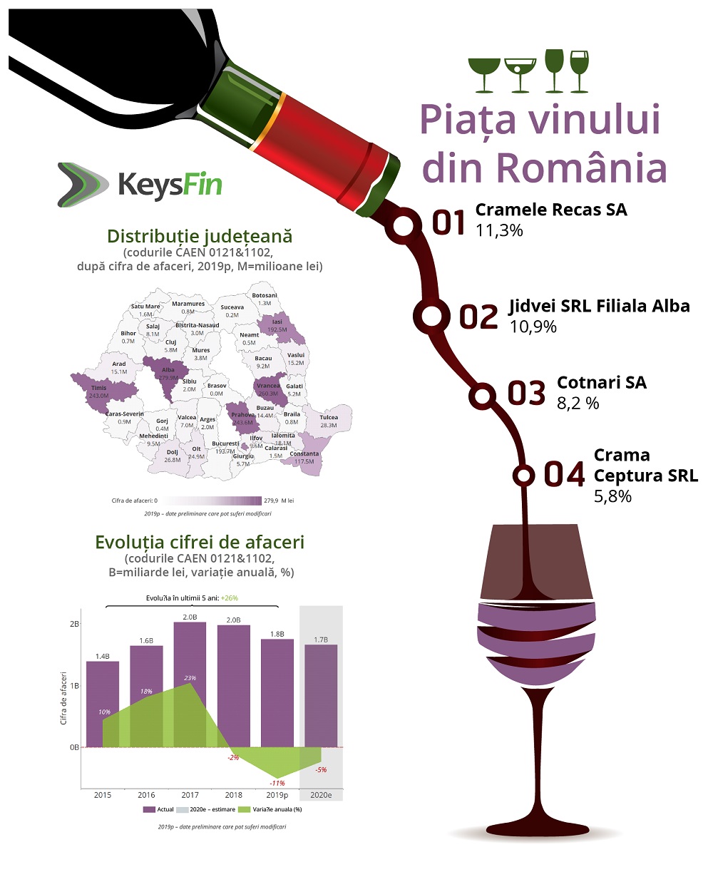 Piața locală a vinului a însumat aproximativ 1,8 miliarde lei în 2019, scăderea fiind de 11,4% față de 2018, iar în 2020 trendul va continua, până la o cifră de afaceri de aproximativ 1,7 miliarde lei, potrivit estimărilor specialiștilor KeysFin. Deși afacerile au scăzut, rezultatul net din 2019 a fost de 87,4 milioane lei, de aproape 10 ori mai mare față de cel din 2018 și, totodată, cel mai bun rezultat din ultimii 10 ani.